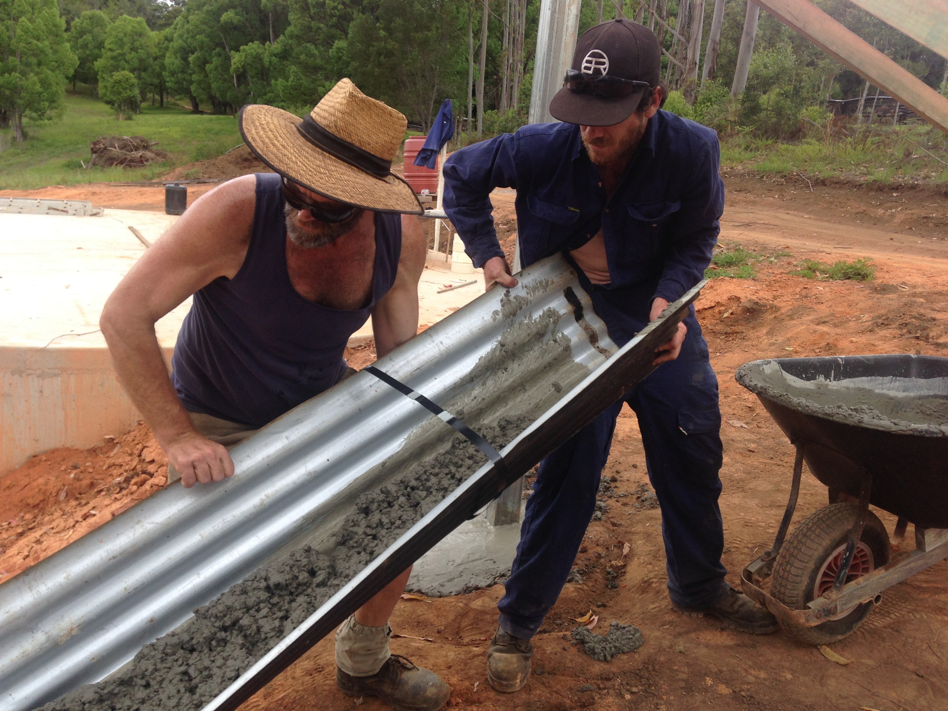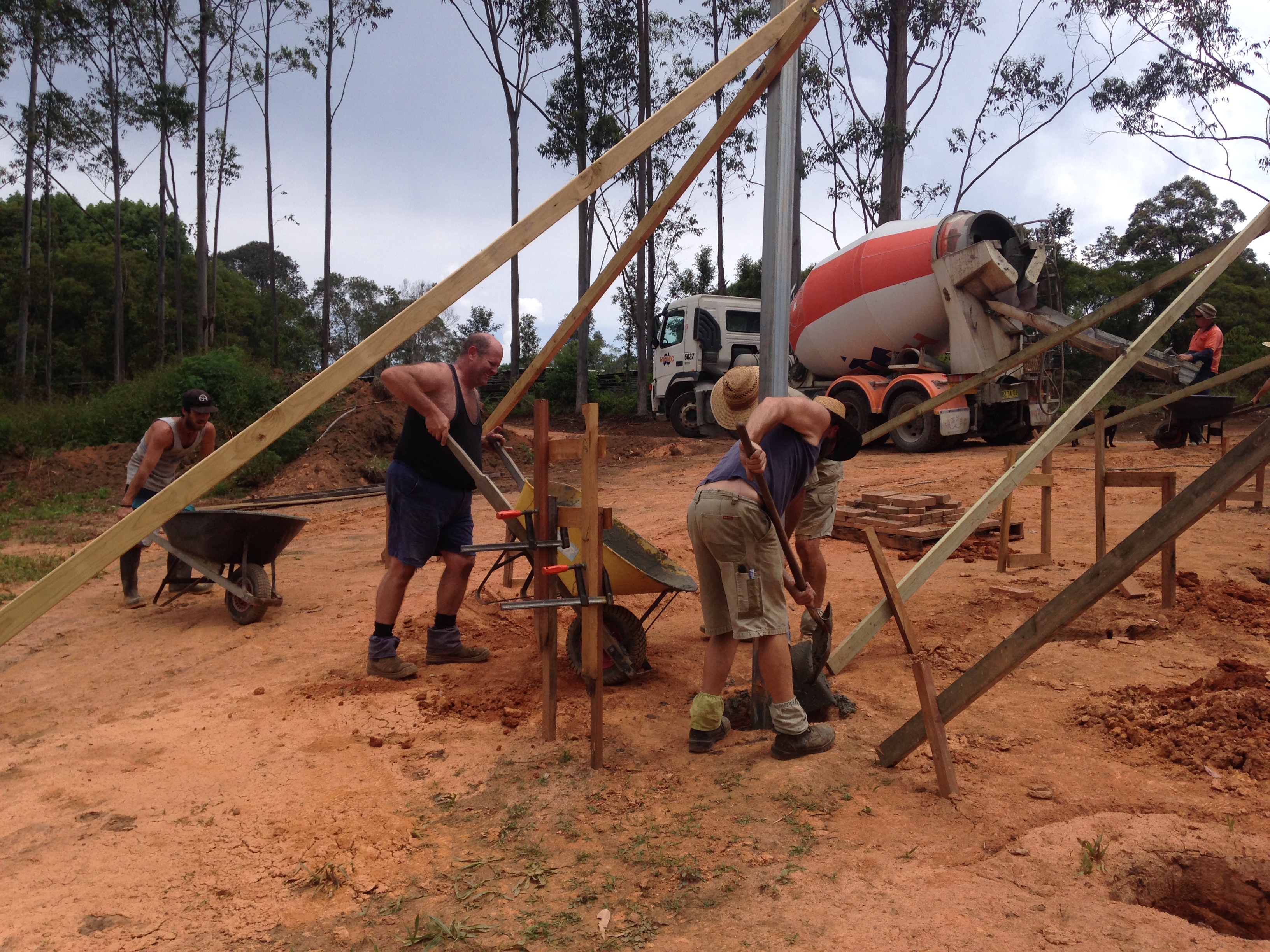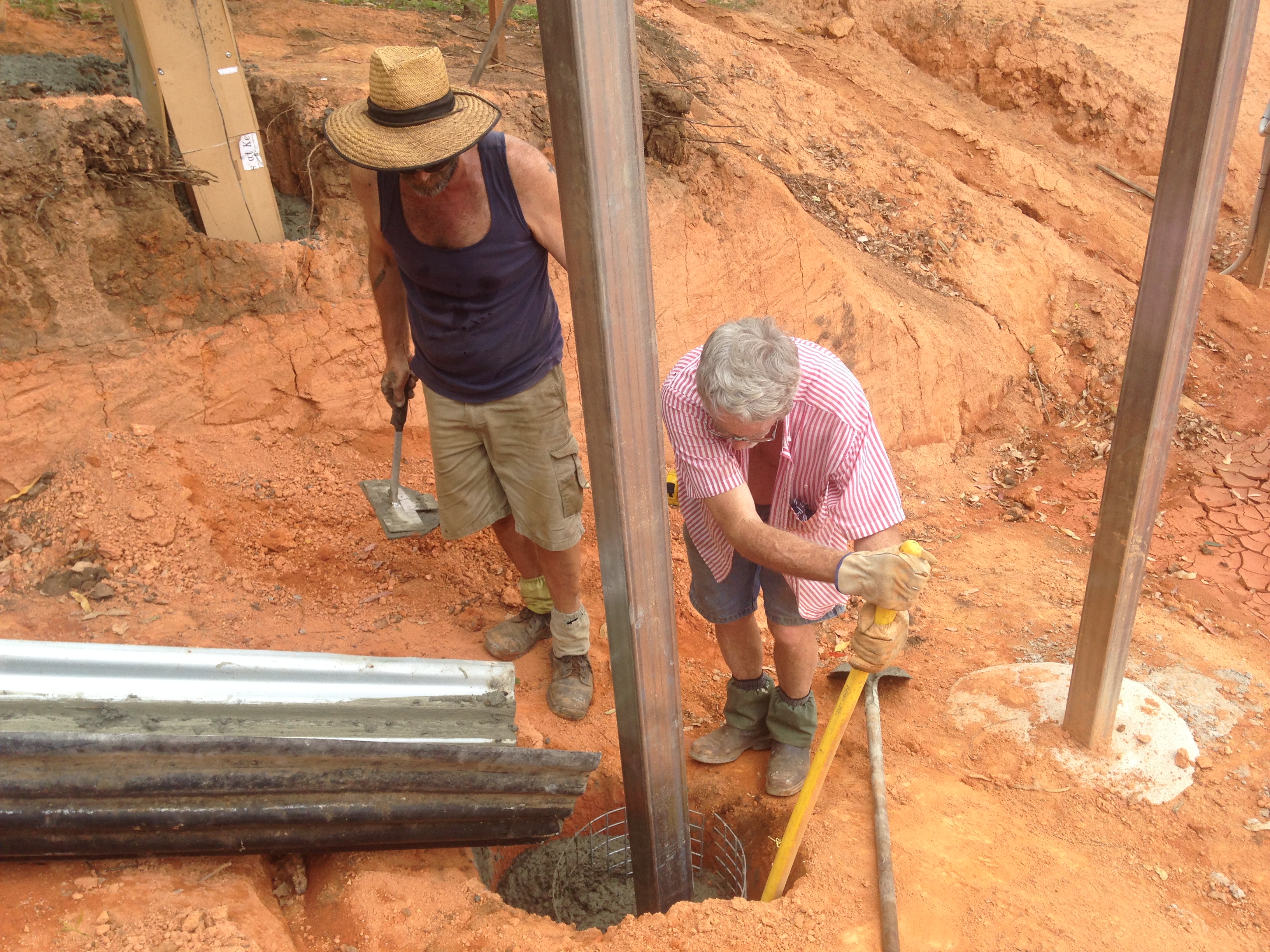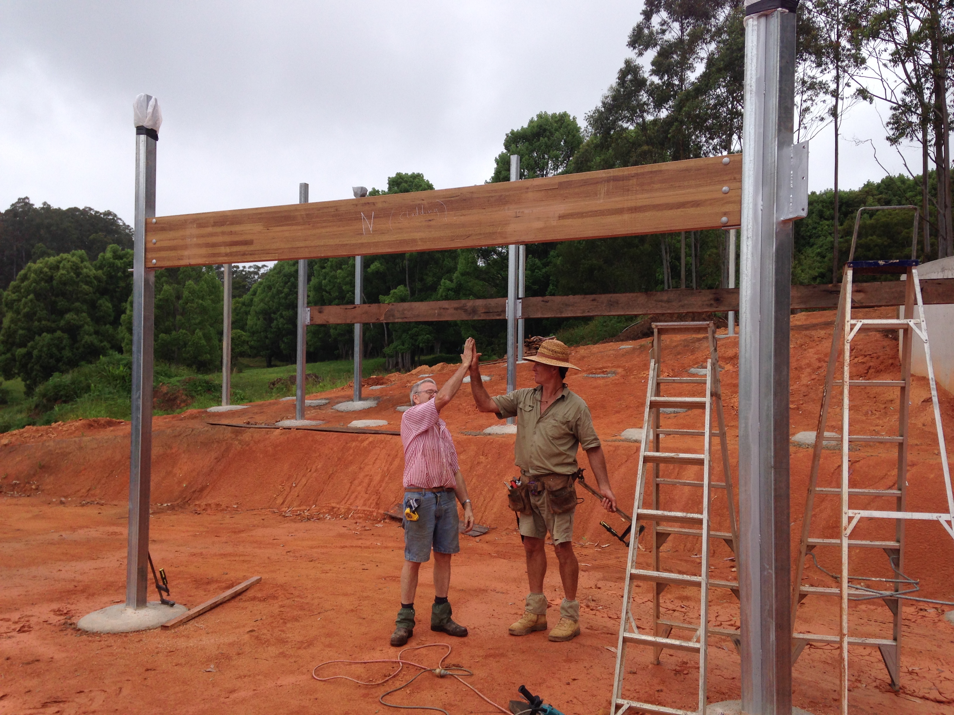 Bellingen House Construction Posted on November 9, 2015 by mikehbotton Posted in Uncategorized The first of Roger’s laminated beams is fitted: perfect fit! 26 October 2015, excavation of pier holes is completed. Steel posts are installed and braced and the weather holds off while concrete footings are poured. Share this: Click to share on X (Opens in new window) X Click to share on Facebook (Opens in new window) Facebook Like Loading... Related